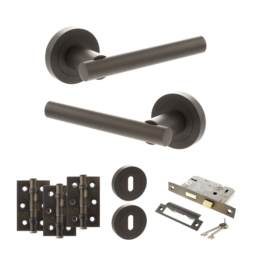STATUS Nebraska Door Handle Pack (3 Lever Lock Set - 3" CE Sashlock, 3" Fire Rated Hinges x3) - Urban Dark Bronze