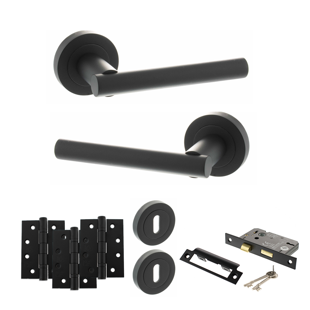 STATUS Nebraska Door Handle Pack (3 Lever Lock Set - 3" CE Sashlock, 4" Fire Rated Hinges x3) - Matt Black