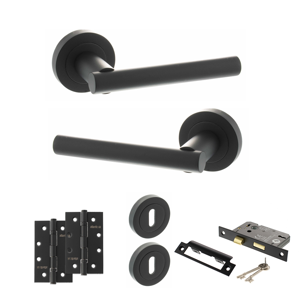 STATUS Nebraska Door Handle Pack (3 Lever Lock Set - 2.5" CE Sashlock, 4" Slim Knuckle Hinges x2) - Matt Black