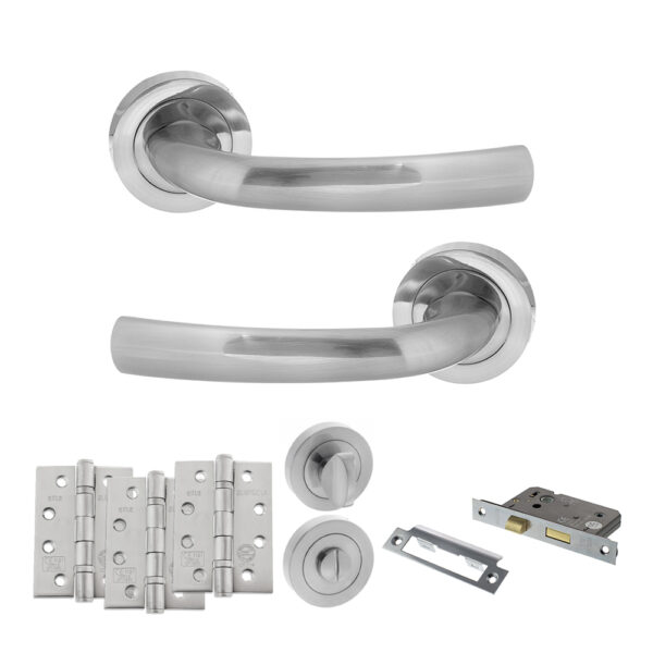 STATUS Nevada Door Handle Pack (Bathroom Set – 3″ CE Bathroom Lock, 4″ Fire Rated Hinges x3) – Satin Chrome