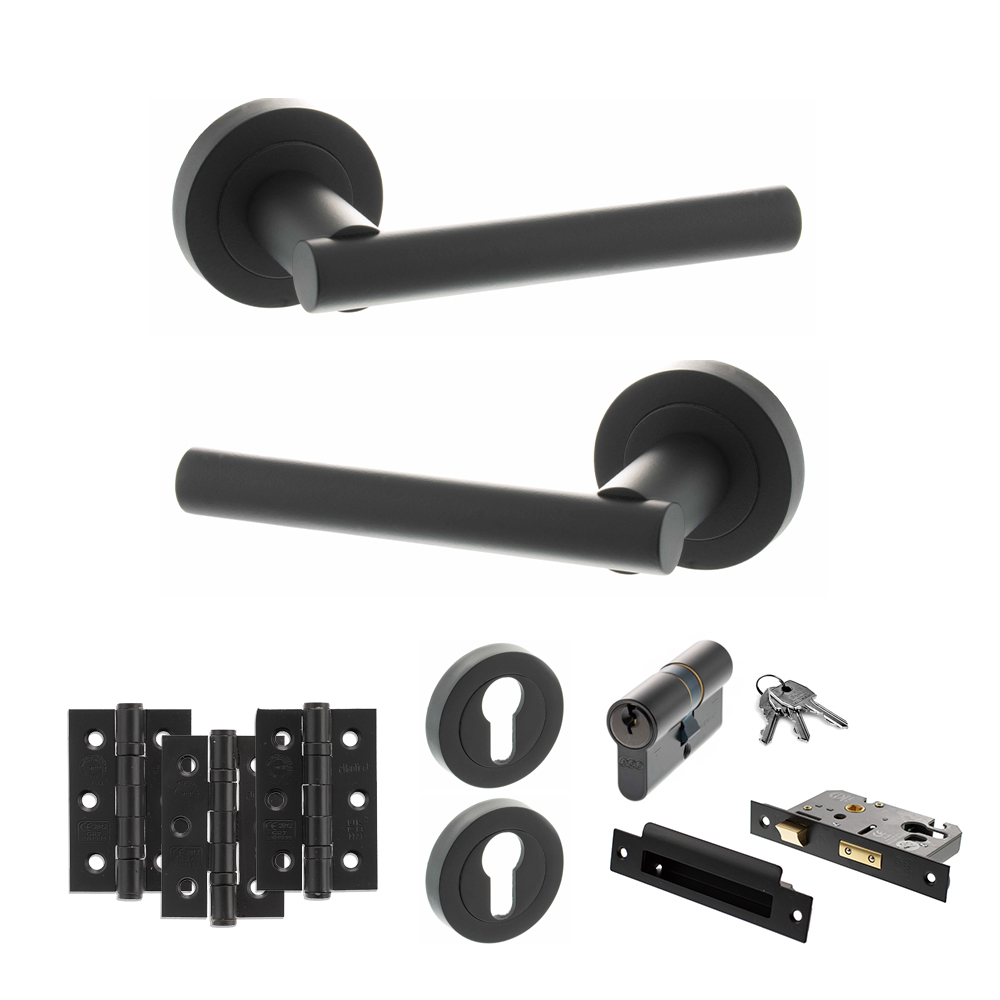 STATUS Nebraska Door Handle Pack (Euro Lock Set - 2.5" CE Sashlock, 3" Fire Rated Hinges x3) - Matt Black