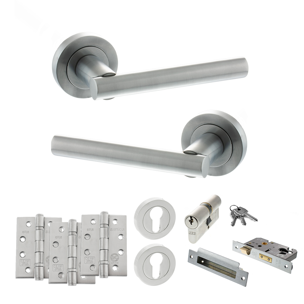 STATUS Nebraska Door Handle Pack (Euro Lock Set - 2.5" CE Sashlock, 4" Fire Rated Hinges x3) - Satin Chrome