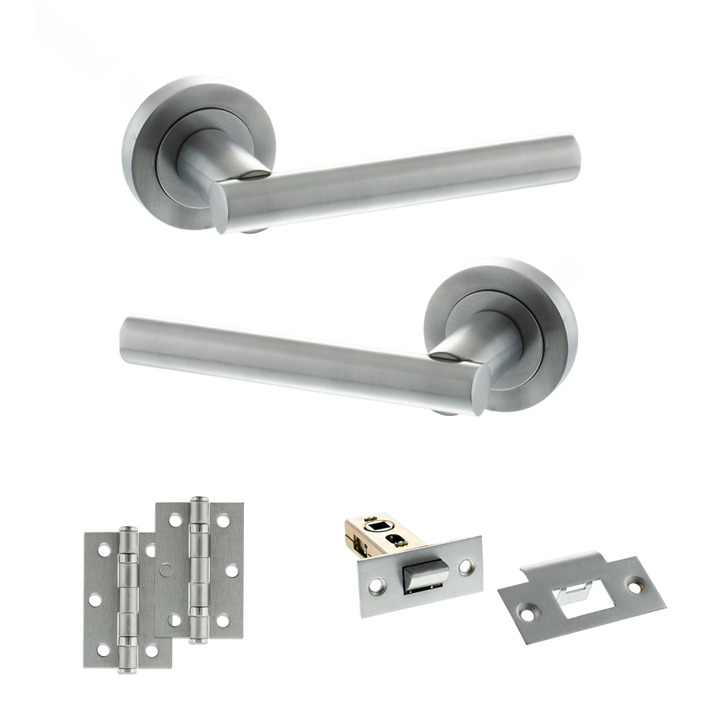 Upgrade your interior doors with the Satin Chrome Latch Pack. This essential door hardware kit combines a smooth tubular latch with premium lever handles and hinges for a consistent, modern look throughout your home.