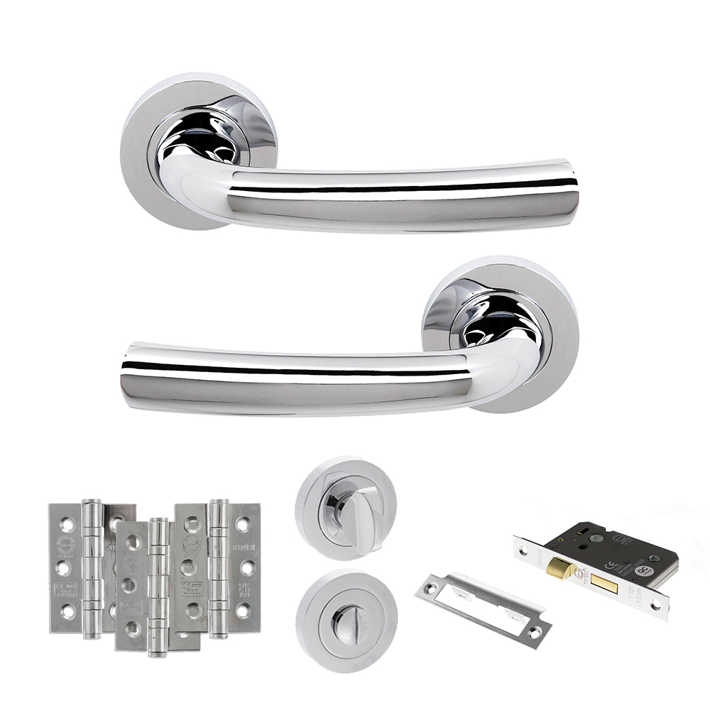 STATUS Nevada Door Handle Pack (Bathroom Set – 3″ CE Bathroom Lock, 4″ Fire Rated Hinges x3) – Polished Chrome