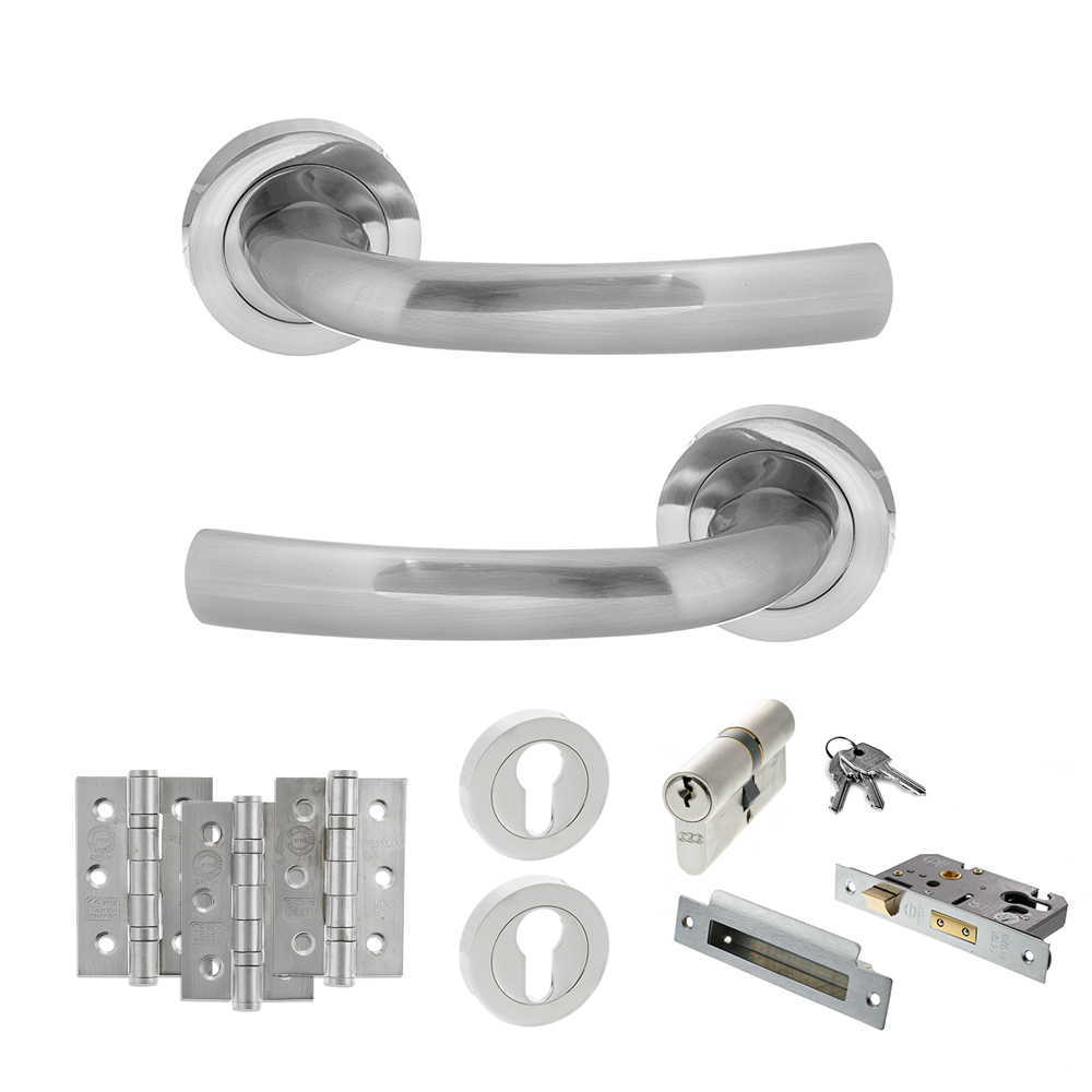 STATUS Nevada Door Handle Pack (Euro Lock Set – 2.5″ CE Sashlock, 3″ Fire Rated Hinges x3) – Satin Chrome