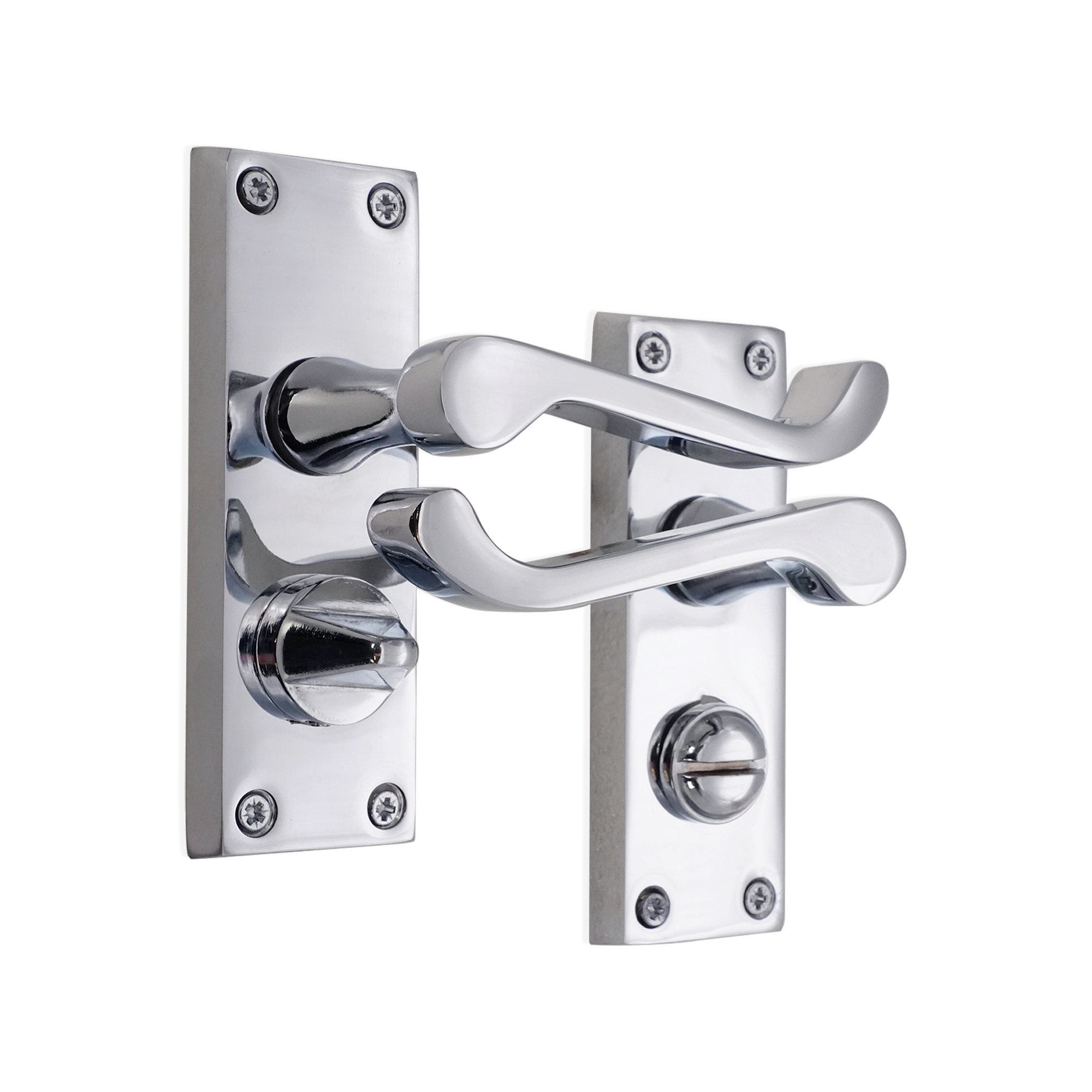 Our traditional style, scroll lever door handles on latch integrated on a rectangular bathroom lock backplate, encompassing modern design with a comfortable Victorian scroll shaped lever for interior doors.