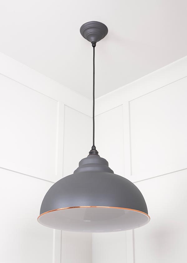Our Harborne pendants embody classic British design. Their rounded edges and unique shape will create an eye-catching focal point in any room. All our pendants are made to order with a three to four week lead time. Our light fittings are dimmable when fitted with a compatible dimmable LED bulb. Supplied fully wired with matching ceiling rose and all necessary fixings. 1m of black fabric cable provided as standard. Bulb: LED Only – 6W Maximum (purchased separately) Our pendants are available in a wide range of colours and finishes. We also offer a bespoke colour service – please contact us for further information. Our Accent pendants are spun from solid copper. When lit, the white gloss interior bounces light and creates a radiant glow, the brightest of our finishes. These pendants work well with a warmer bulb.